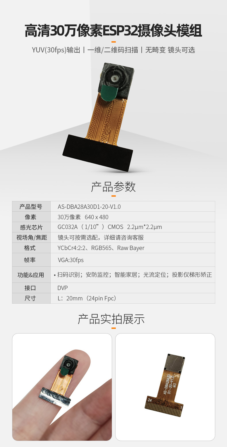 深圳厂家30万像素GC032A扫码识别投影仪精准梯形矫正微型ESP32摄像头模组