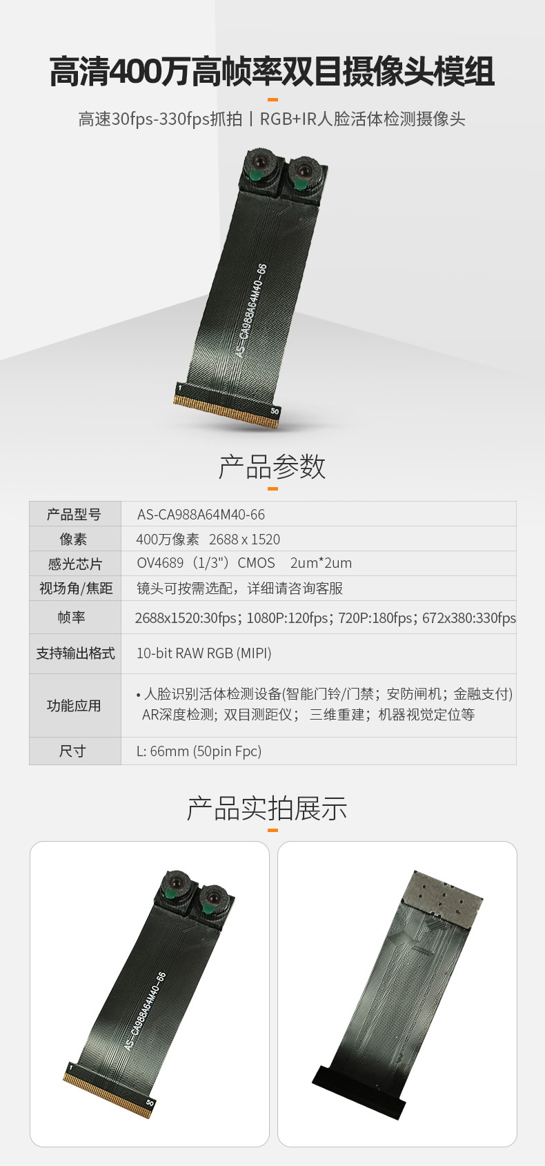泓嘉影像OV4689高清400万RGB+IR人脸活体检测识别双目摄像头模组Fpc-50pin