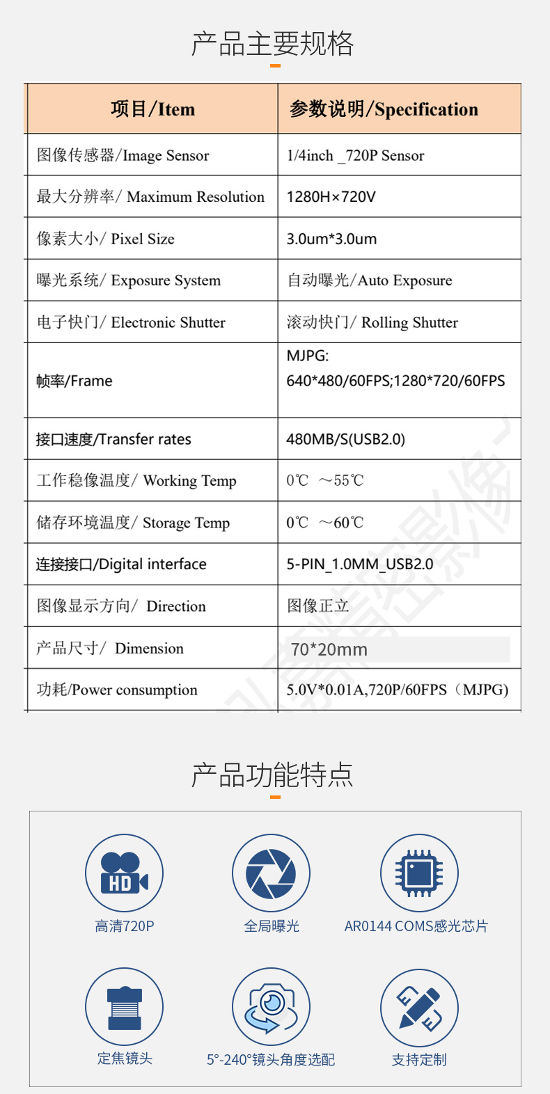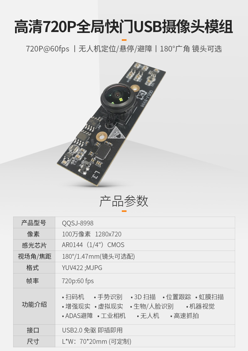 高清720P 60fps AR0144全局曝光高速抓拍无人机避障悬停USB摄像头模组