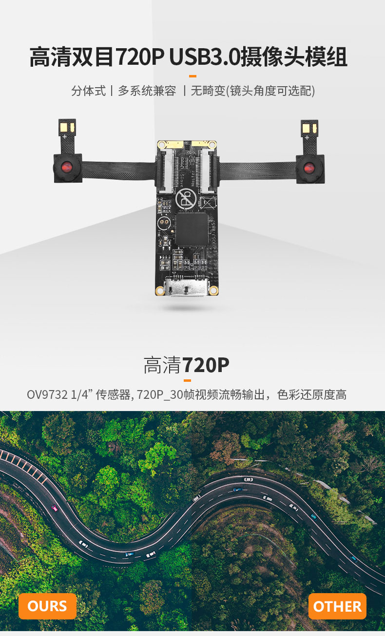 高清100万双720p无畸变OV9732分体式双目扫描识别活体检测摄像头模组USB3.0