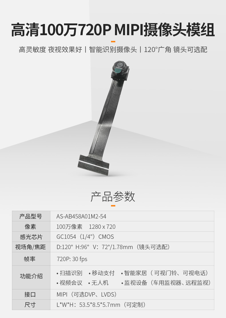 100万像素720P GC1054低功耗高清无畸变监控扫码识别mipi摄像头模组fpc