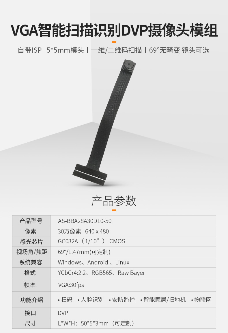 VGA 30帧fps 30w万像素GC032A带isp扫码识别AI微型摄像头模组DVP