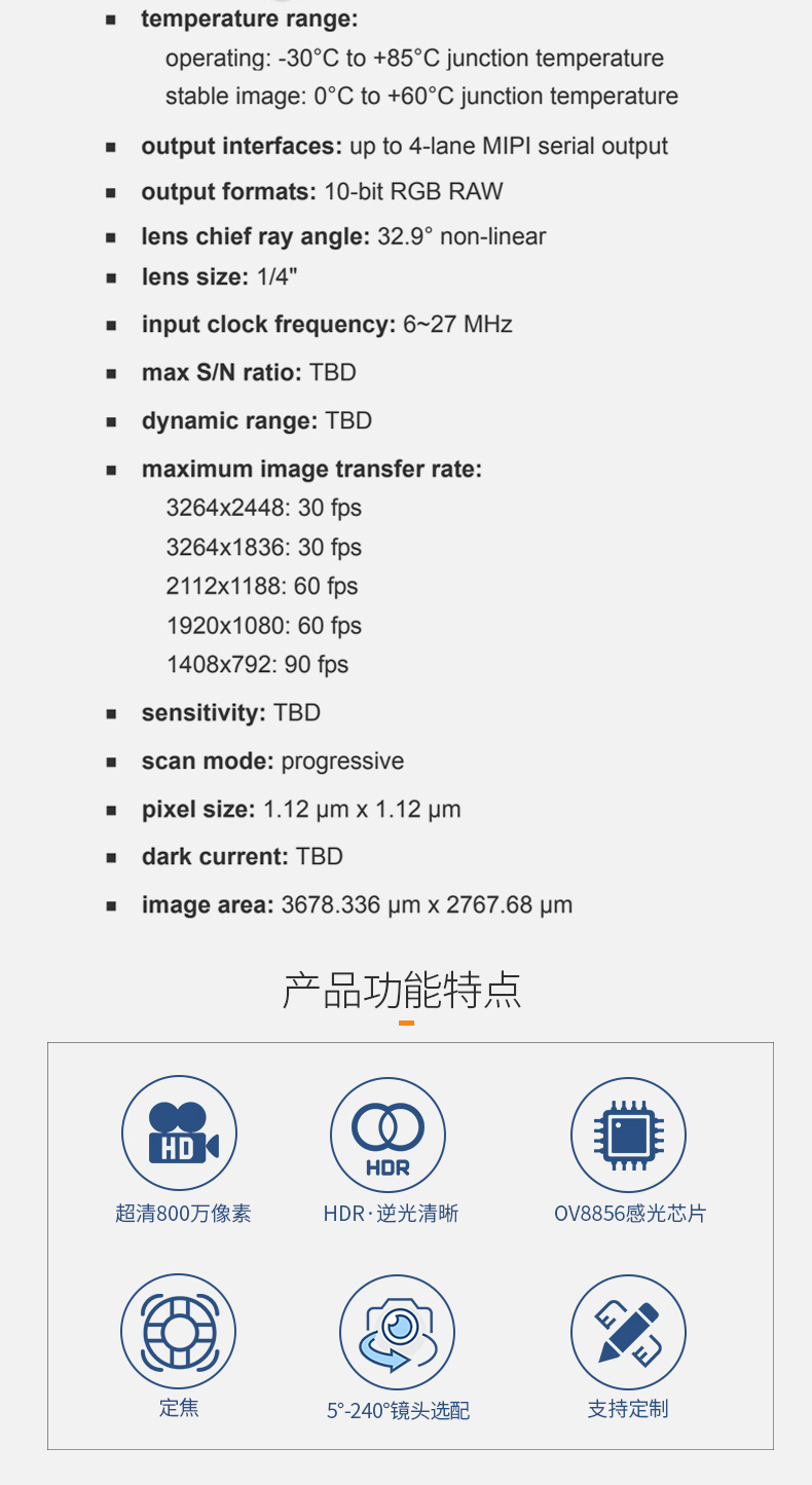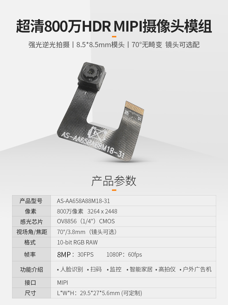 800万像素OV8856 HDR宽动态逆光监控MIPI高拍仪快递扫描出库仪摄像头模组