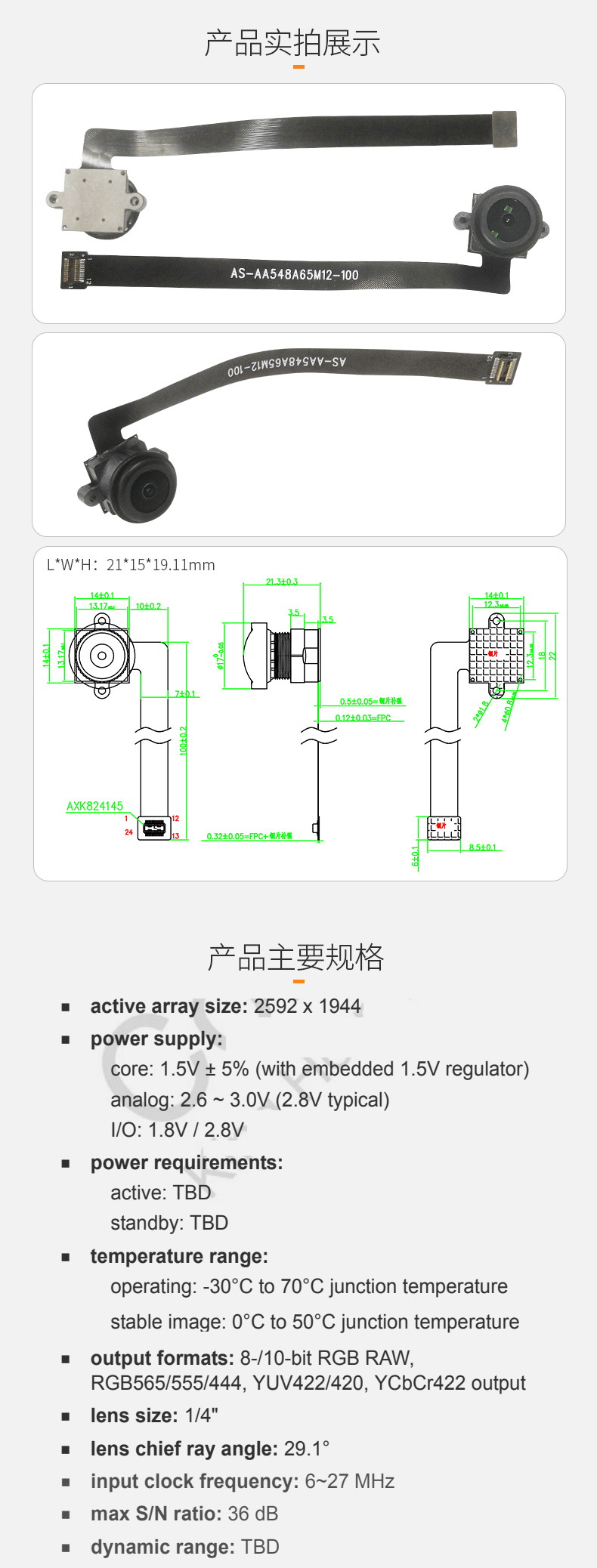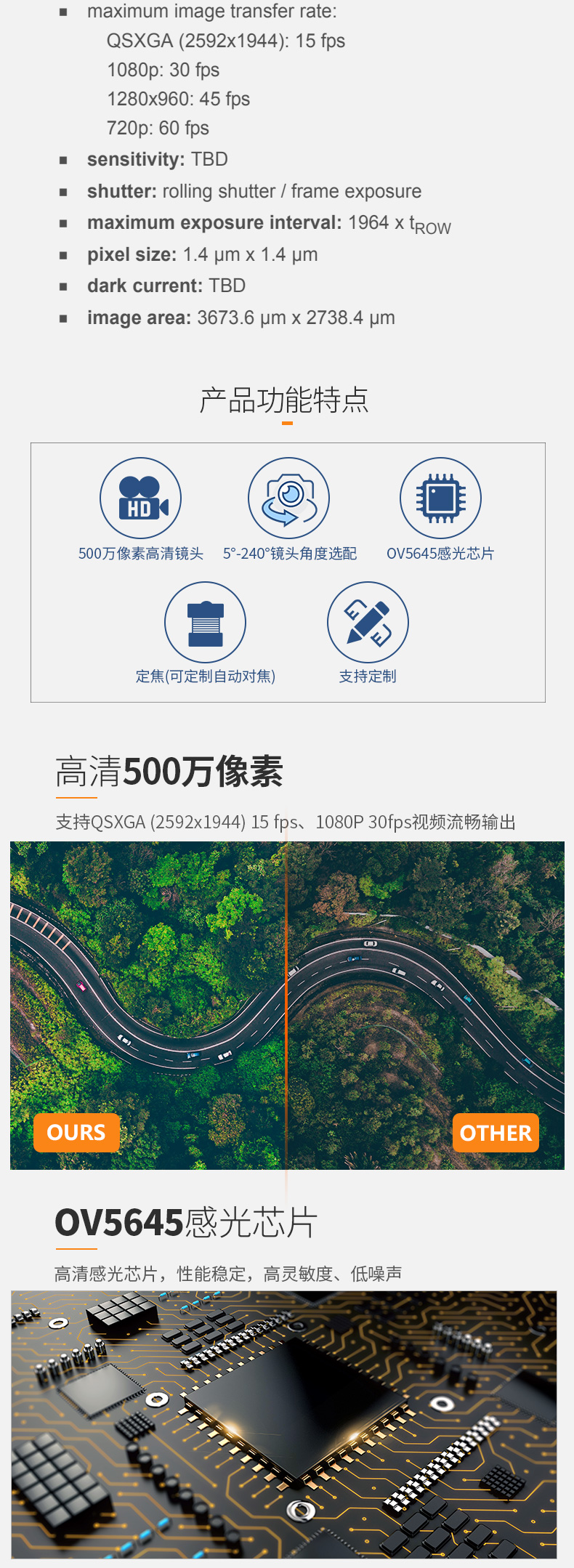 500万像素OV5645 2K 1080p高清RAW yuv输出mipi定焦广角摄像头模组