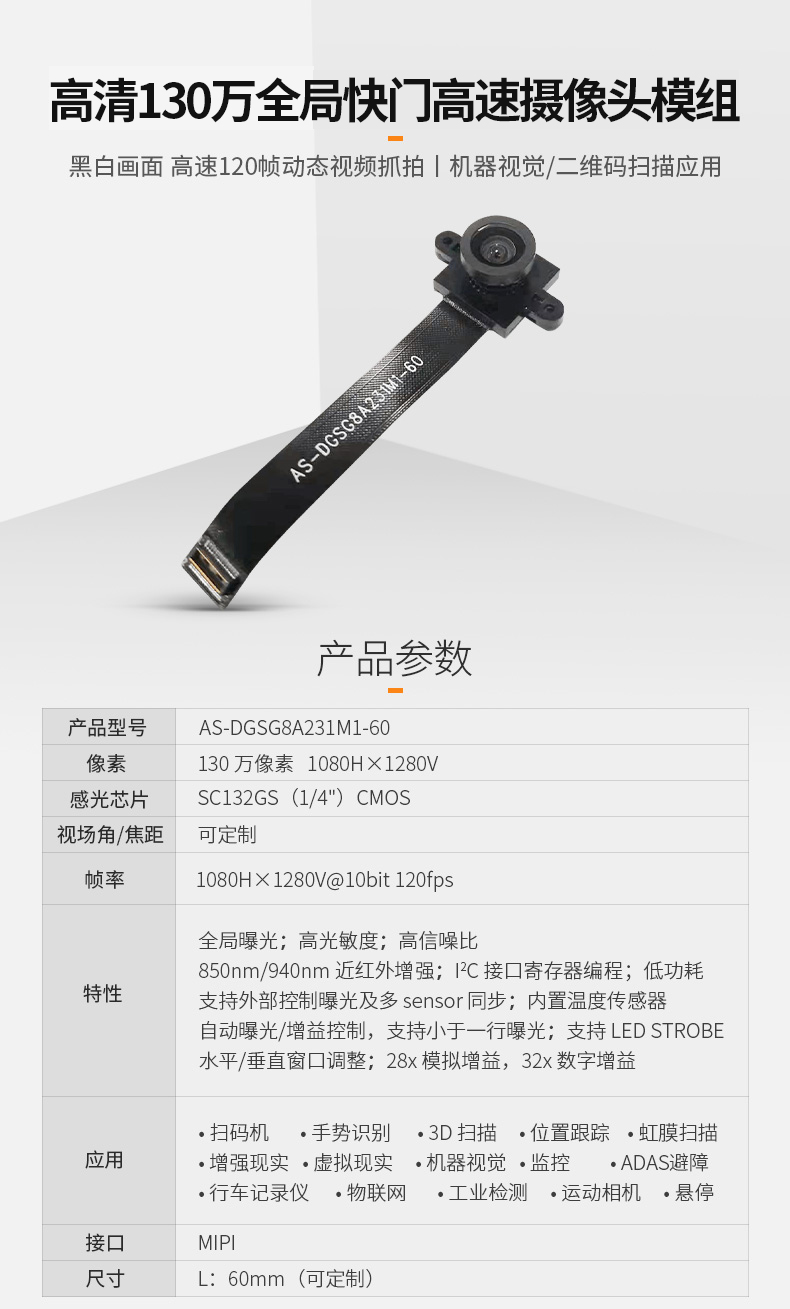 fpc高清130万120fps全局曝光高速抓拍扫码识别mipi SC132GS VR摄像头模组