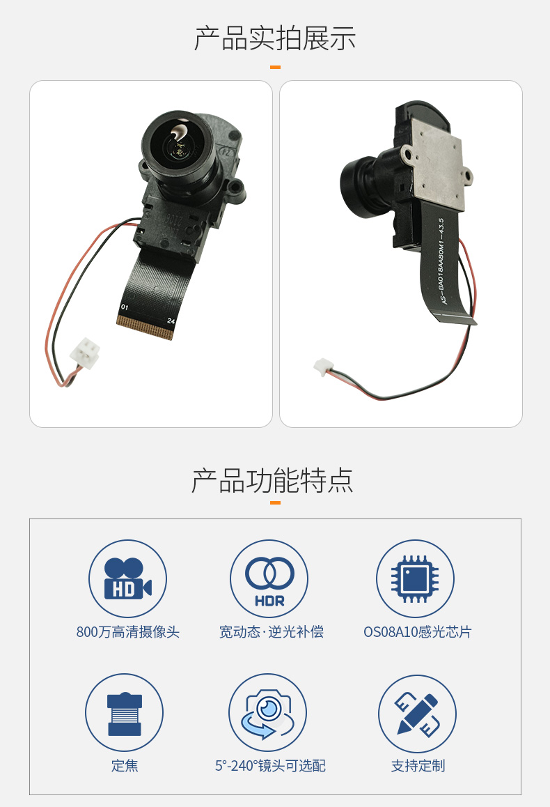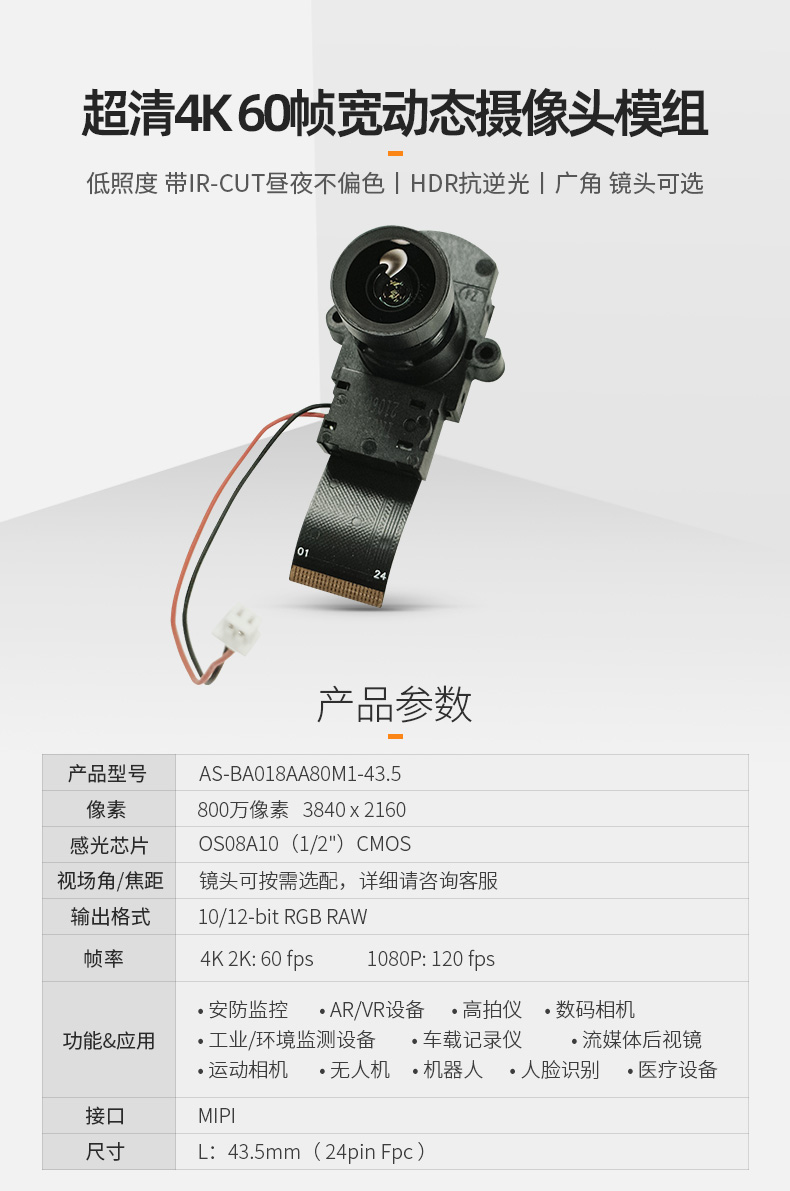 4K 60帧OS08A10高清宽动态低照度IR-CUT昼夜不偏色夜视摄像头模组Mipi