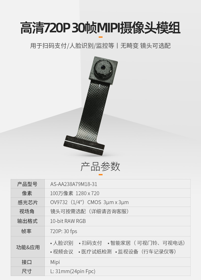 Ov9732无畸变人脸识别图像采集Mipi高速传输摄像头模块100万720P