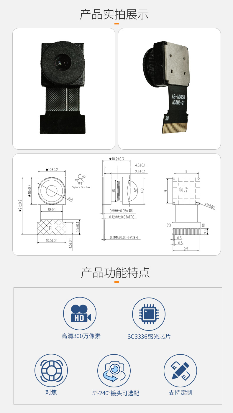 Mipi高清300万低功耗人脸识别闸机门禁机SC3336摄像头模组20pin FPC模块