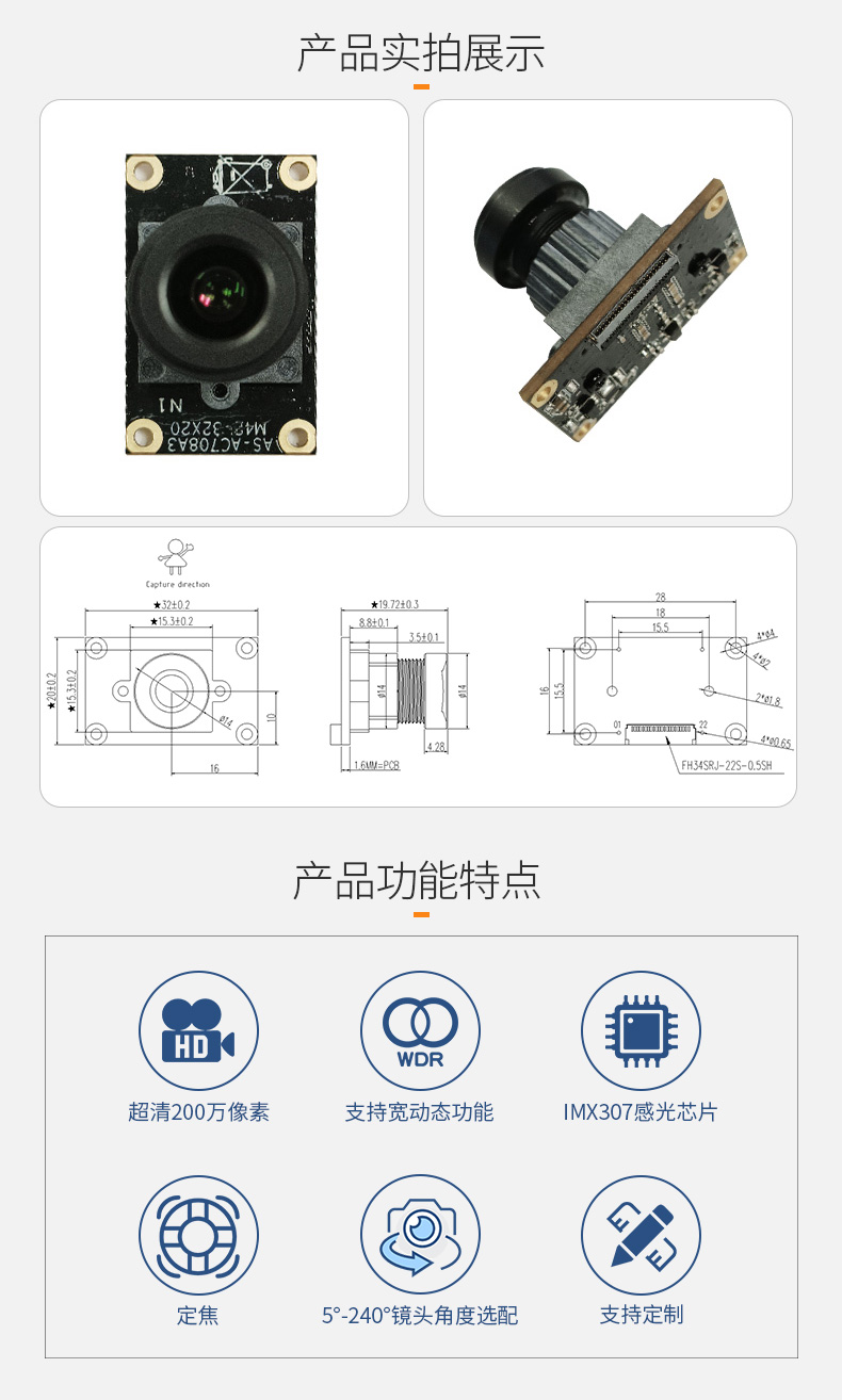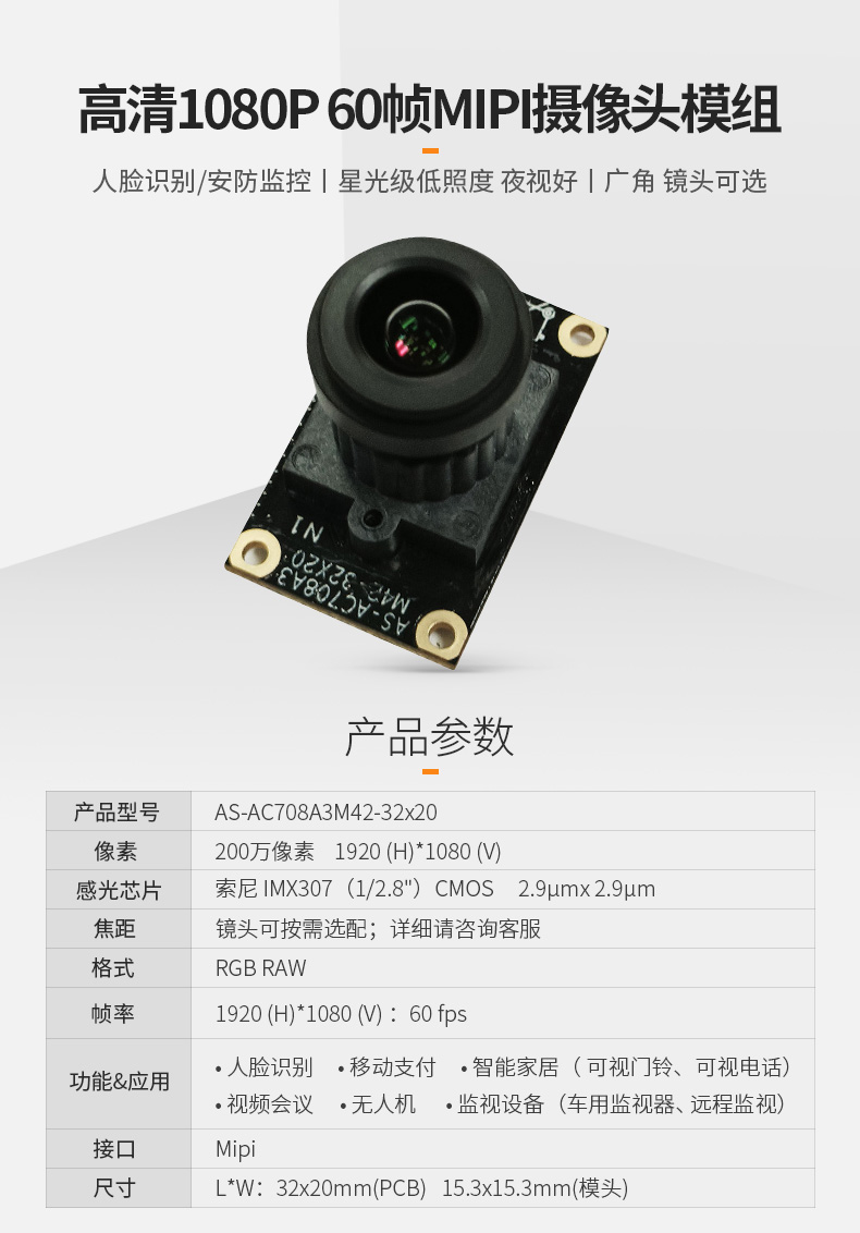 200万MIPI定焦智能平板运动DV高清1080P摄像头模组星光低照度IMX307