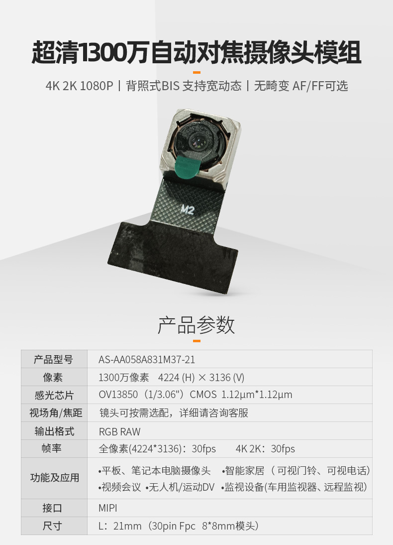 1300万像素OV13850高拍仪AF摄像头模组mipi接口30pin适配AIoT开发板