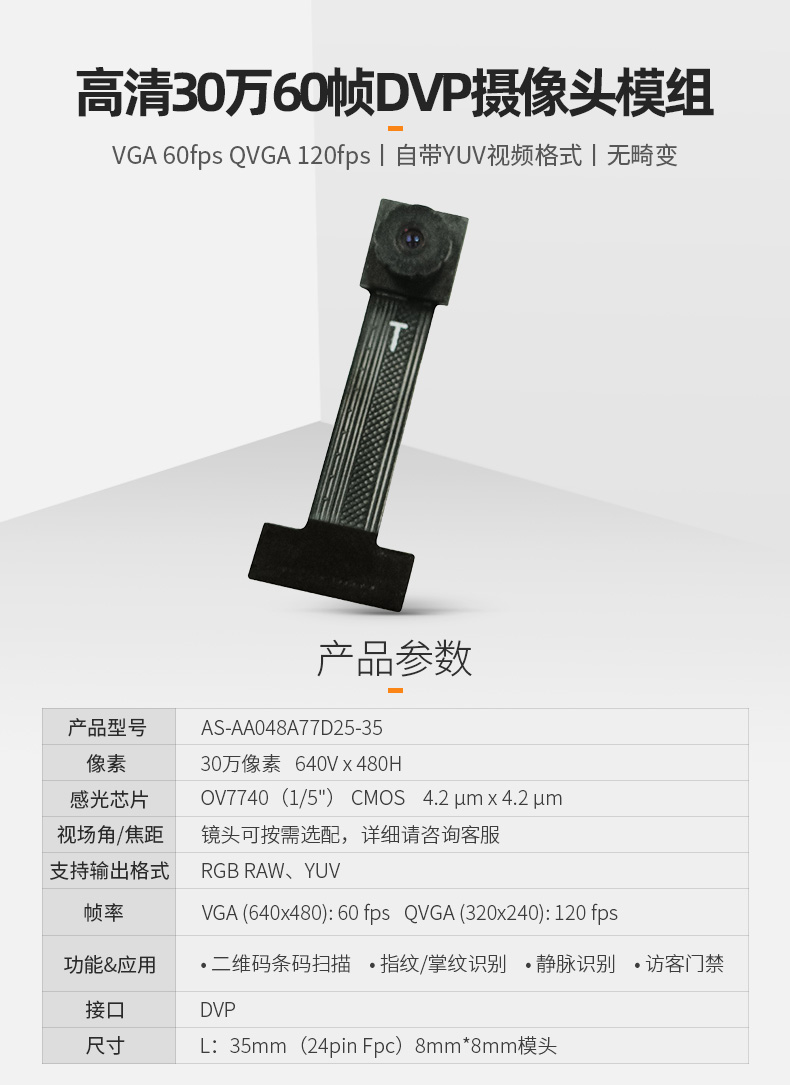 30万像素微型微距镜头模块60fps 120fps扫码AI识别门铃门禁OV7740摄像头模组