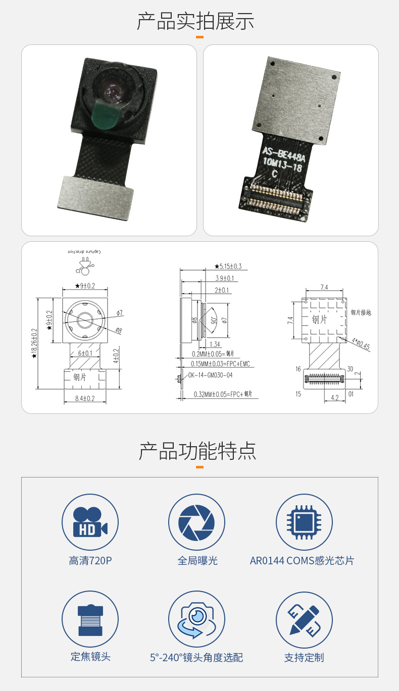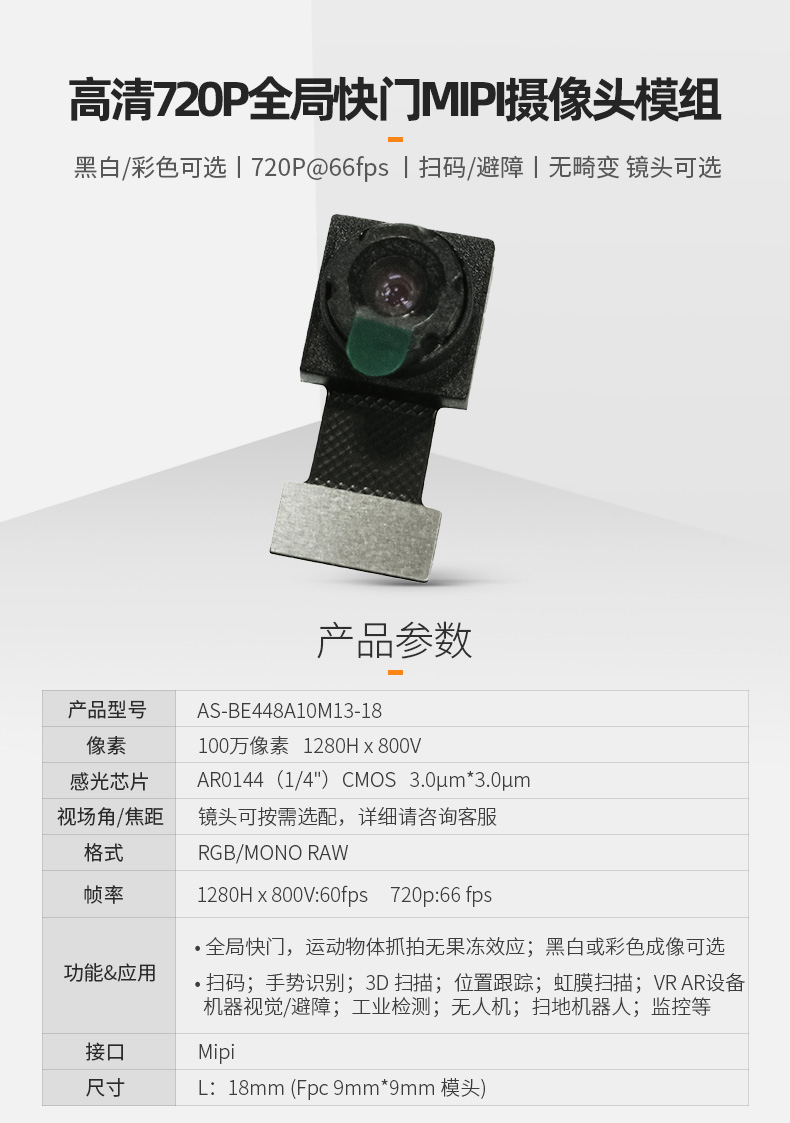 100万720P安森美AR0144全局快门高速拍照MIPI黑白/彩色摄像头模组Mipi
