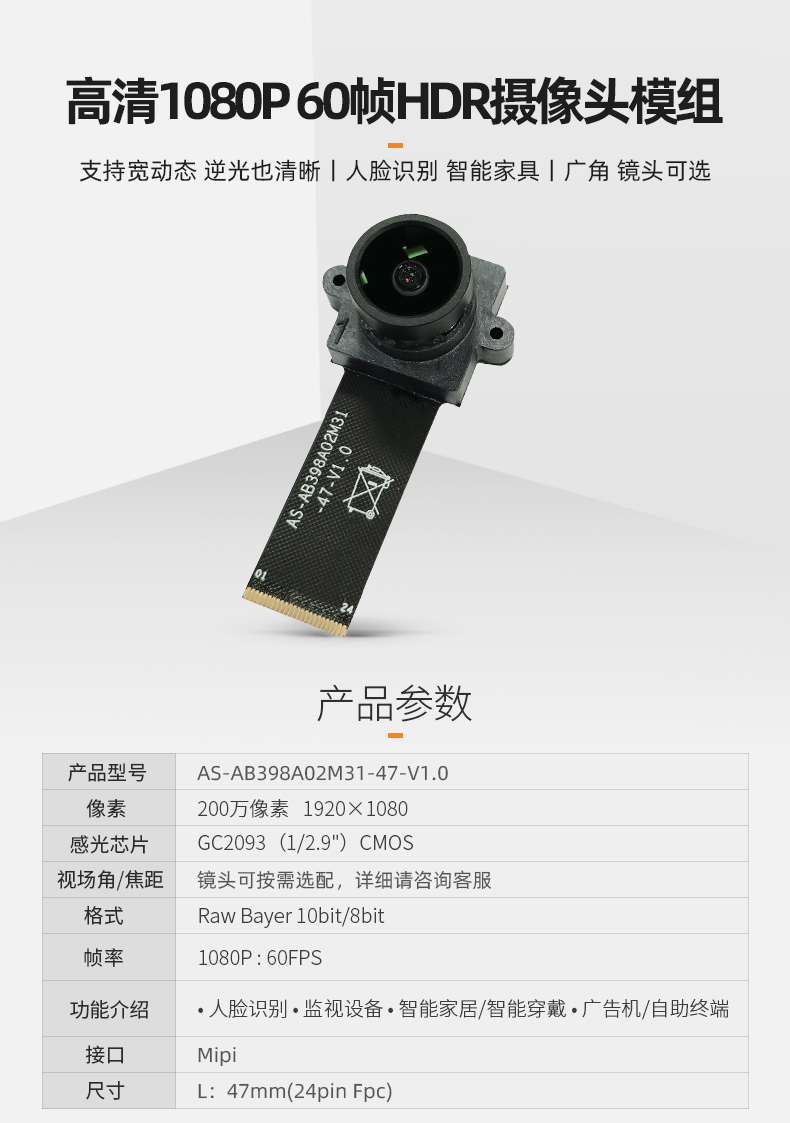 200万高清1080P夜视GC2093 HDR宽动态逆光监控广角MIPI摄像头模组